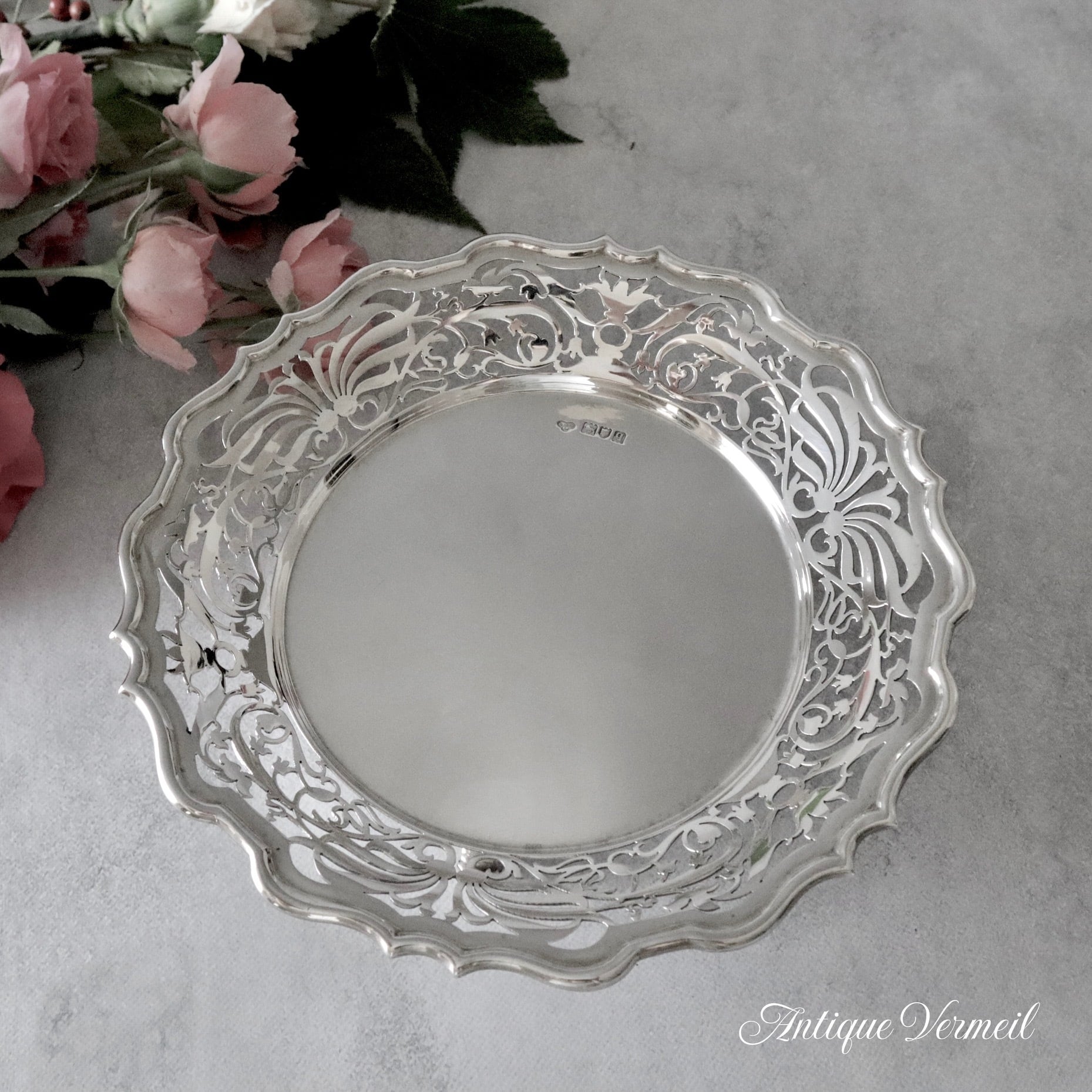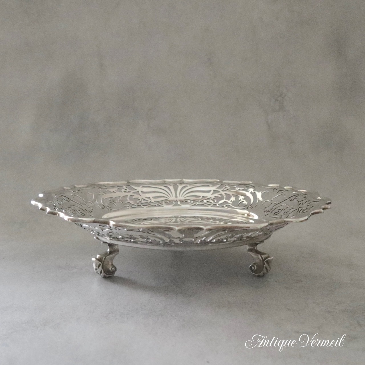 こちらのディッシュはヴィクトリアンからエドワーディアンにかけて活躍したGoldsmiths & Silversmiths工房の銀器です。今回は同じデザインで足が付いたコンポートも一緒にご紹介できます。
