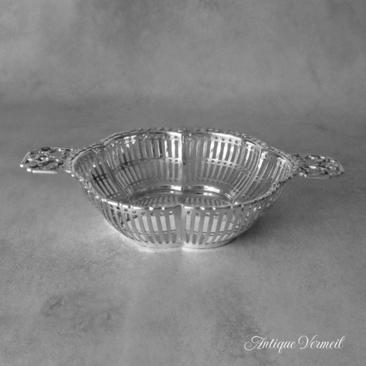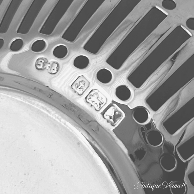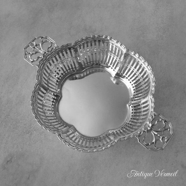 英国銀器の定番のピアッシング装飾ボンボンディッシュです。1922年と新しい時代へと移り変わる空気を反映してかハンドルはアールデコの影響を受けたユニークなデザインです。