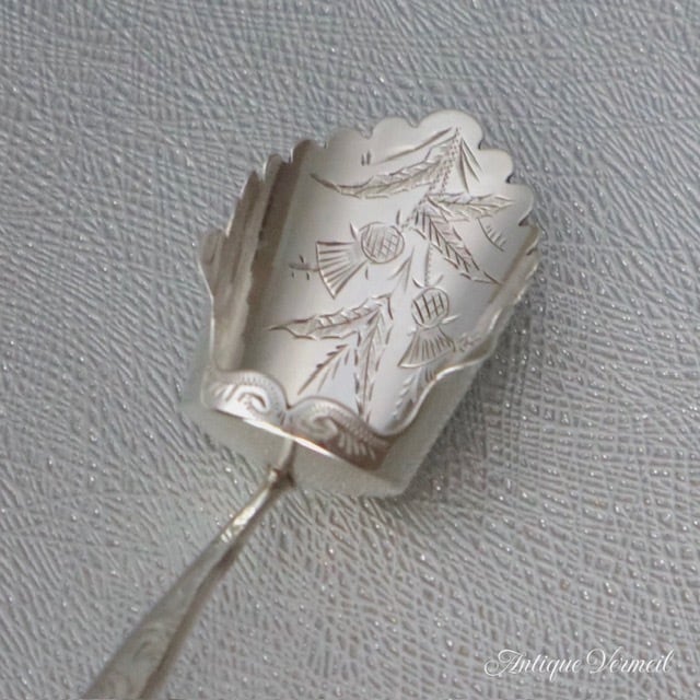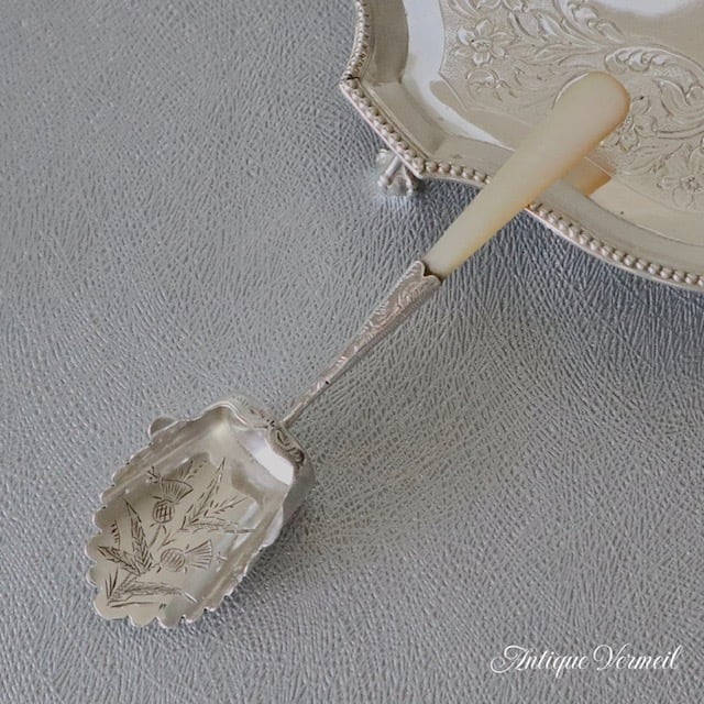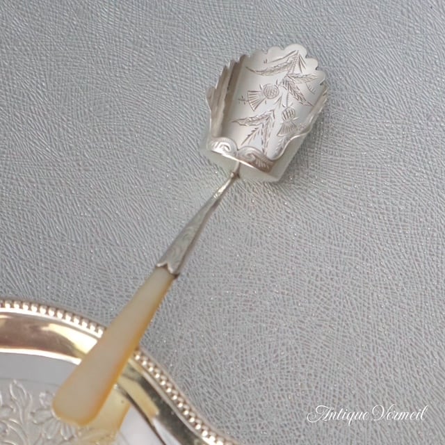 スコップ型のボウルにアザミの花が彫刻され、白蝶貝との接合部分にはヴィクトリアンらしいスクロール文様が彫り込まれています。