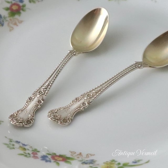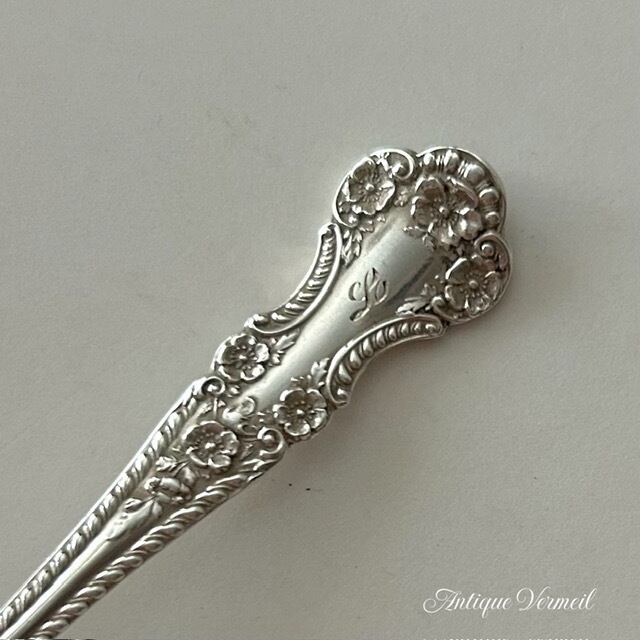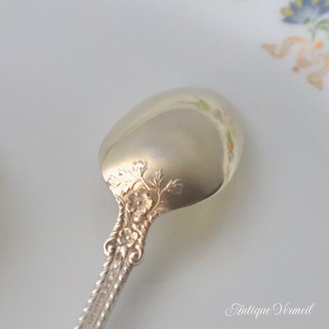ハンドルトップには金鳳花の装飾とモノグラム、スプーンの裏側にも花と葉の浮彫が施されています。ボウルには金鍍金が施されています。