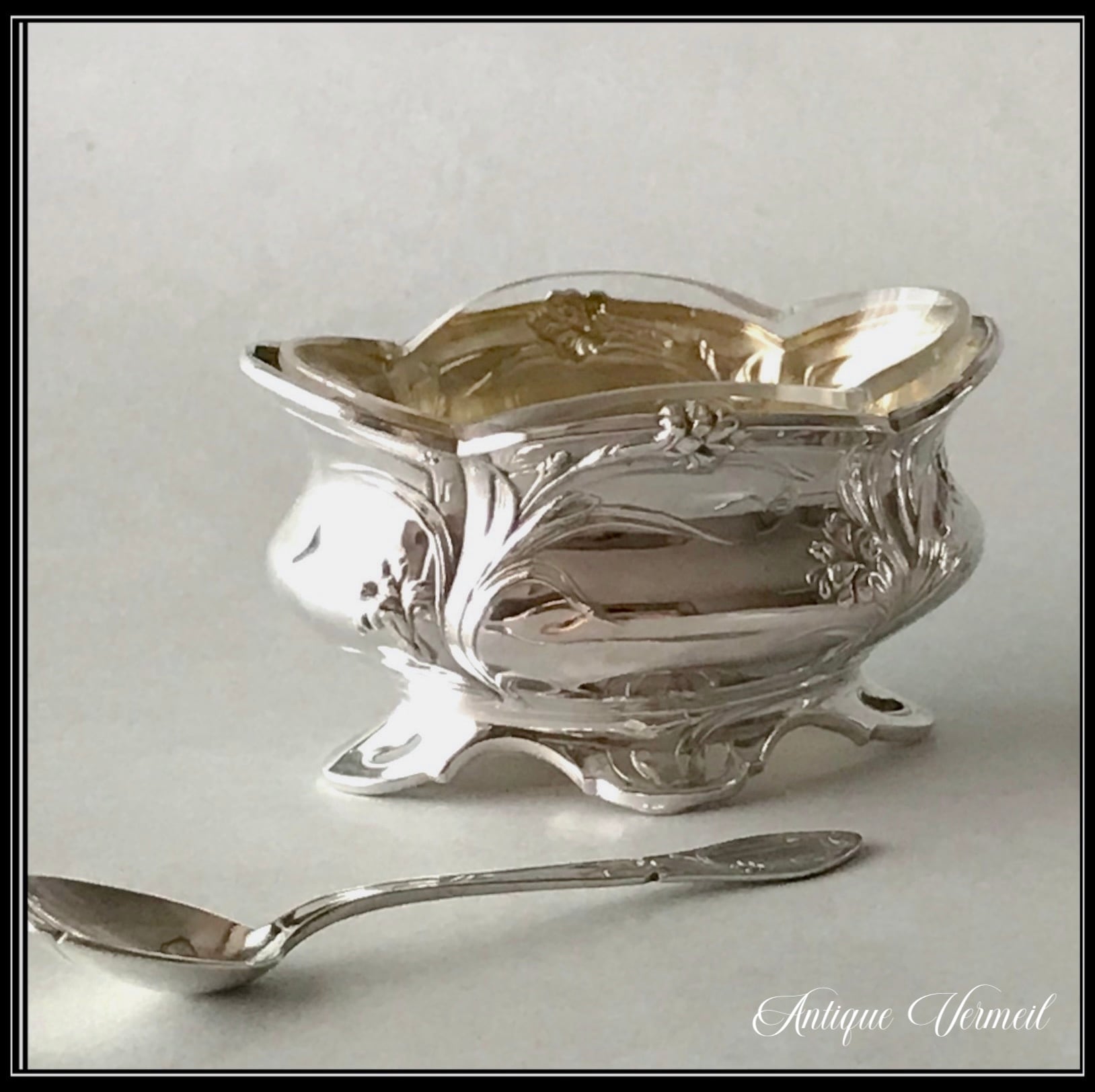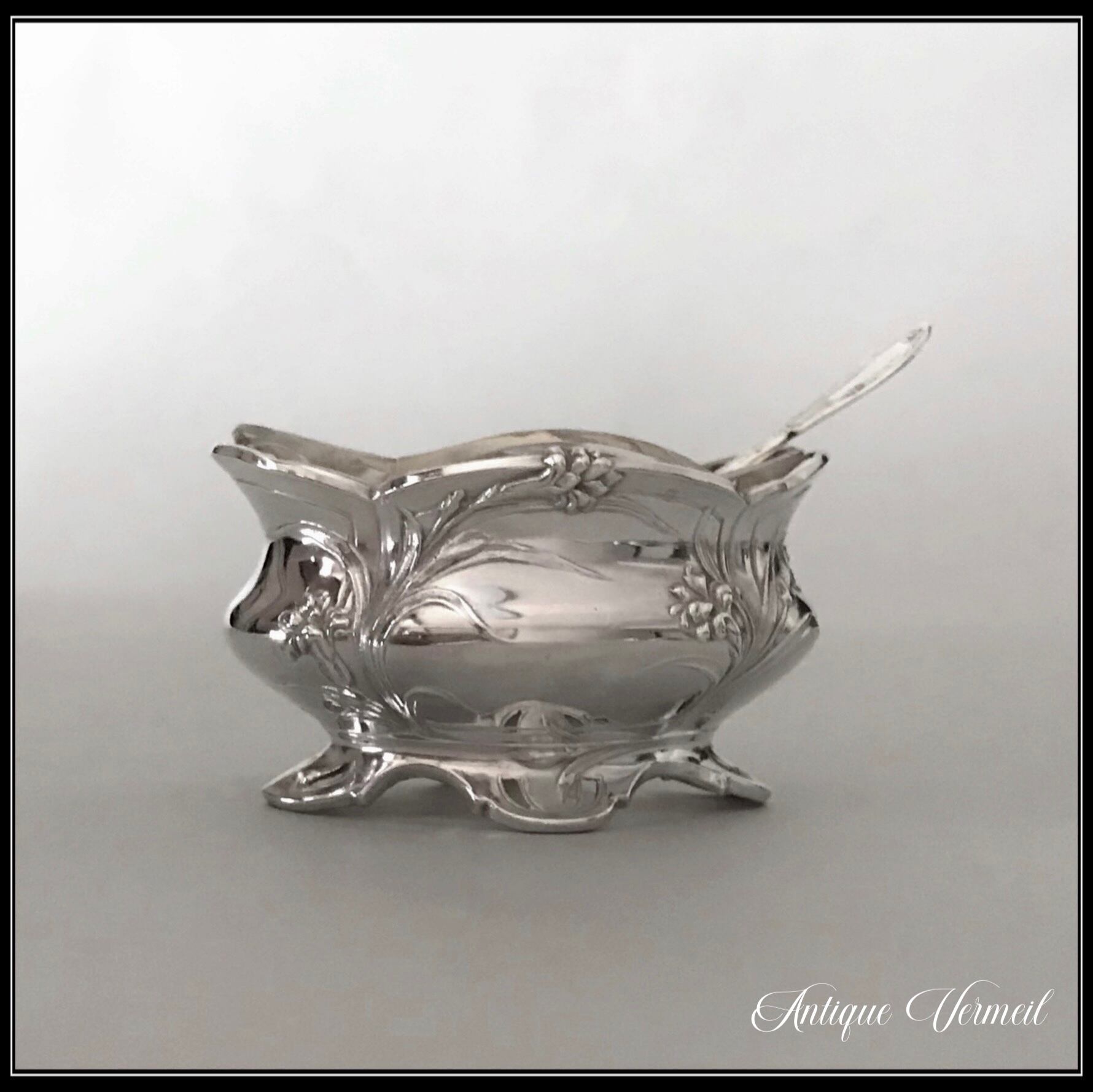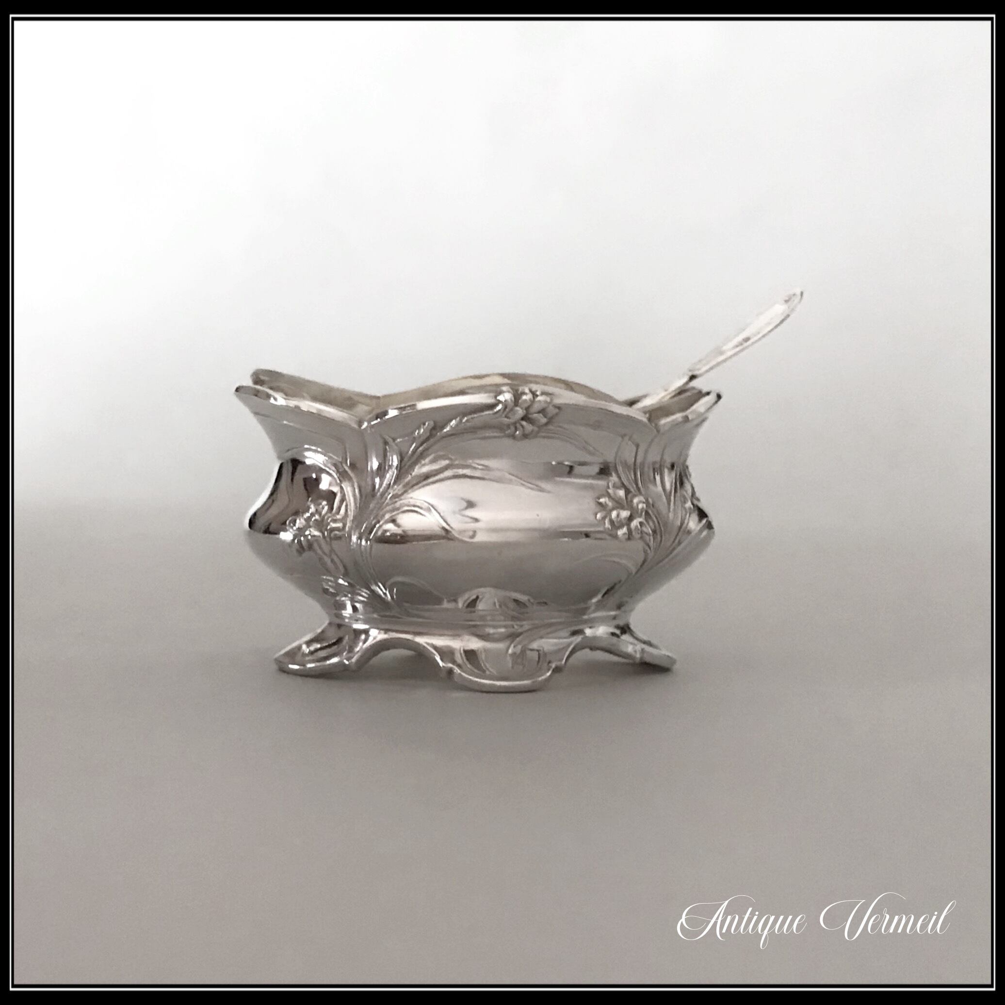 アールヌーボー様式の花文様の純銀サリエール(塩入れ)とスプーンです。