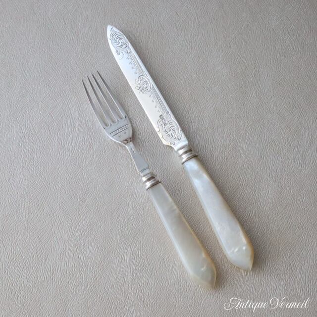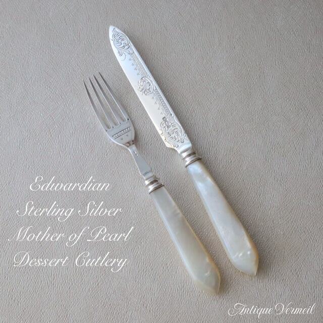 エドワーディアン期の白蝶貝ハンドル・デザートナイフ&フォークのセットです。
