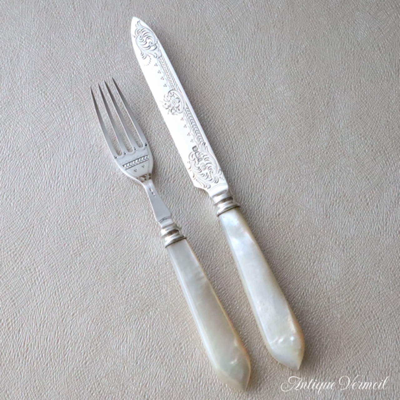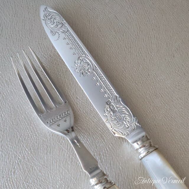 ナイフのブレード(刃)には優雅な彫刻による装飾。フォークは4本刃で同じパターンの装飾が施されています。白蝶貝のハンドルは持ちやすいシンプルなタイプです。