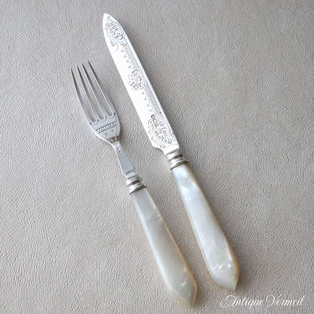 貴重な白蝶貝を使ったシルバーのカトラリーはヴィクトリアン期に多く製作されました。エドワーディアン、ジョージ5世と時代が下がるにつれて直線的でシンプルなデザインへと変遷していきます。