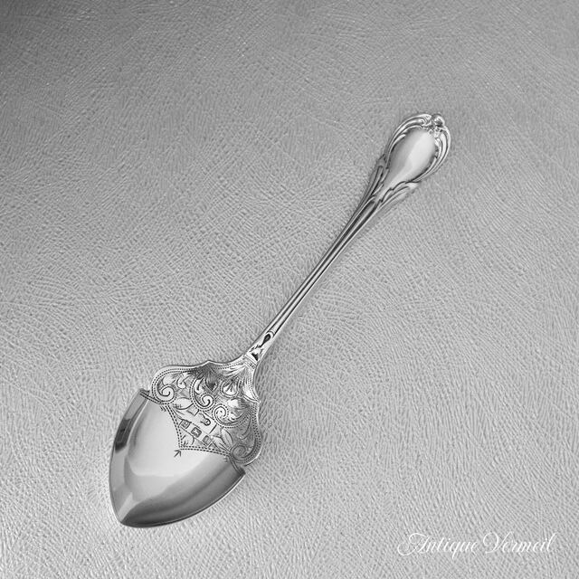 エドワーディアンが終わり新しい装飾スタイルであるアールデコ期への過渡期らしい斬新なデザインのジャムスプーンです。
